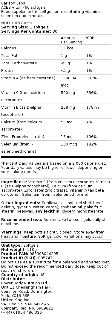 Jeg har taget Carlsons ACES + zink i årevis og kan attestere produktets kvalitet. Jeg har problemer med at tage de fleste Vit C-tilskud, og jeg synes, at dette ikke irriterer min mave. Derudover kan jeg godt lide at få den synergistiske effekt af Vits A, C, E og Zink sammen. Vil ikke tøve med at anbefale det! Nyttig for huden og måske mod rynker. Meget professionel og tidsfølsom levering.