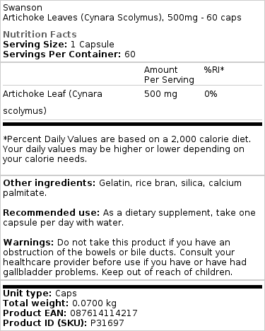 Avastage Swanson Artišokilehtede (Cynara Scolymus) eelised, mis on looduslik toidulisand, mõeldud toetama teie üldist tervist. Iga kapsel sisaldab 500 mg artišokilehte.