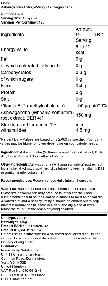 Osavi Ashwagandha Ekstra on toidulisand, mis sisaldab 450 mg ashwagandha (Withania somnifera) juure ekstrakti ja vitamiini B12 (metüülkobalamiin) ühes kapslis. Pakendis on 120 vegankapslit.