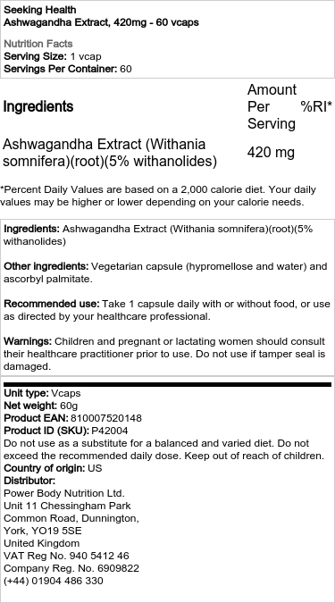 Ashwagandhaekstrakt – 420 mg sisaldab 60 vegetaalset kapslit. iga kapsel sisaldab 420 mg Ashwagandha ekstrakti (Withania somnifera). Toode sobib veganitele ja taimetoitlastele.