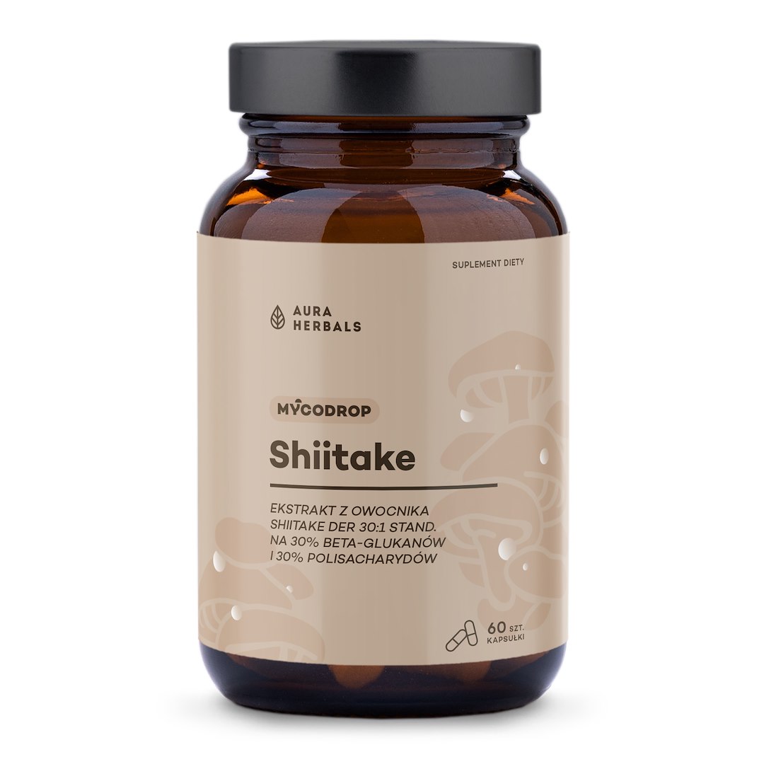 Aura Herbals AURA HERBALS Mycodrop, Shiitake 30:1, 30% beta-glukan (60 kapslit) on toidulisand, mis on pakendatud kapslitena ja mille pakend sisaldab 60 kapslit. Bränd on Aura Herbals.