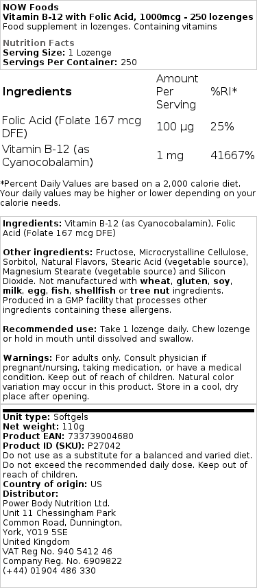Avasta NOW Foods’i B-12-vitamiin foolhappega, mis on pakendatud 250 mugavasse imemistabletti. See toode on valmistatud USA-s, rõhutades kvaliteeti ja looduslikke koostisosi.