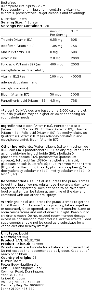BetterYou B-complete Daily Oral Spray on hoolikalt välja töötatud toode, mis toetab tasakaalustatud ja tervislikku eluviisi. Toodet iseloomustavad kvaliteetsed koostisosad ilma kunstlike värvide või säilitusaineteta.