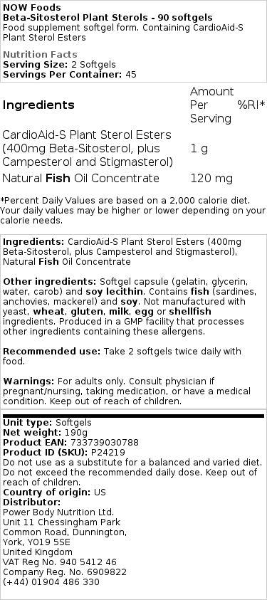 Now er en mellemstor blød gel, der er nem at sluge og tilbyder i alt 0f 400 mg beta sitosterol pr. to kapsler og er økonomisk. Det sælges i dyre prostata-urtekombinationer, men til kun omkring 200 mg, hvilket ikke er nok til at få det fulde udbytte. Du har brug for mellem 400 mg og 600 mg om dagen til prostataproblemer. For generelle fordele ved immunstimulering er 200 til 400 mg om dagen godt. Det er også godt for dit kolesterolniveau, og hjælper med at reducere højt kolesteroltal. At tage det regelmæssigt har hjulpet mig med at se en forbedring i mit behov for at tisse om natten, nu skal jeg kun tisse, når jeg står op om morgenen. Det er en del af min daglige kost, og smagsmæssigt har det ingen, når du sluger det.