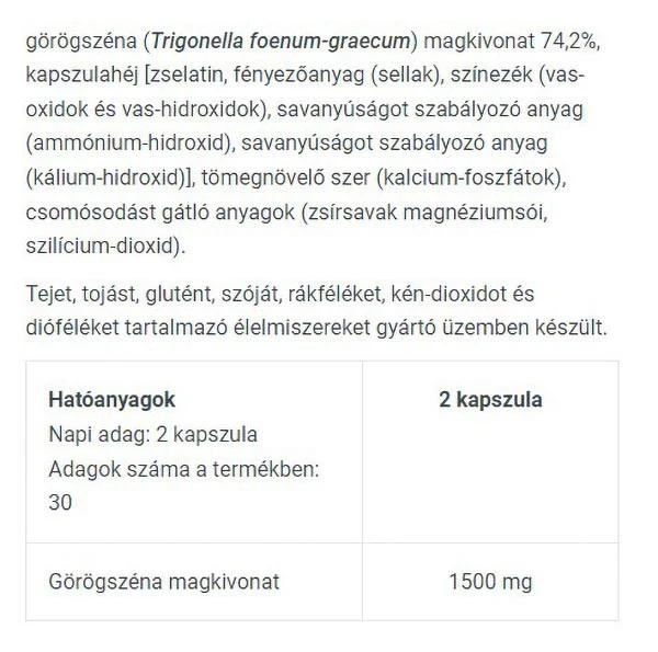 Koostisosad: fenkoli (Trigonella foenum-graecum) seemne ekstrakt, kapsli kest [želatiin, pealiskate (šellak), värvaine (raudoksiidid ja hüdroksiidid), happesuse regulaator (ammooniumhüdroksiid), happesuse regulaator (kaaliumhüdroksiid)], täiteaine (kaltsiumfosfaadid), paakumisvastased ained (magneesiumisoolad rasvhapetest, ränidioksiid).