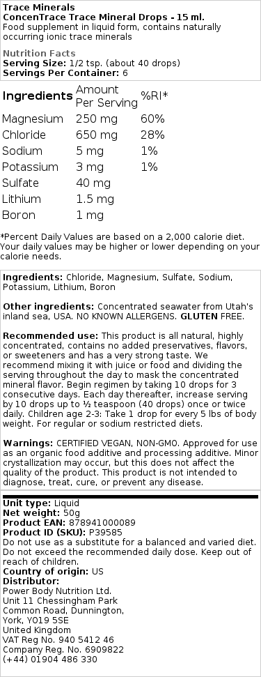 Meie Trace Mineral Drops on ekstraheeritud otse looduslikust allikast, tagades kõrge puhtusastme ja autentsuse. Pakend sisaldab 118 ml vedelikku, mida on lihtne igapäevaselt doseerida ja kasutada.