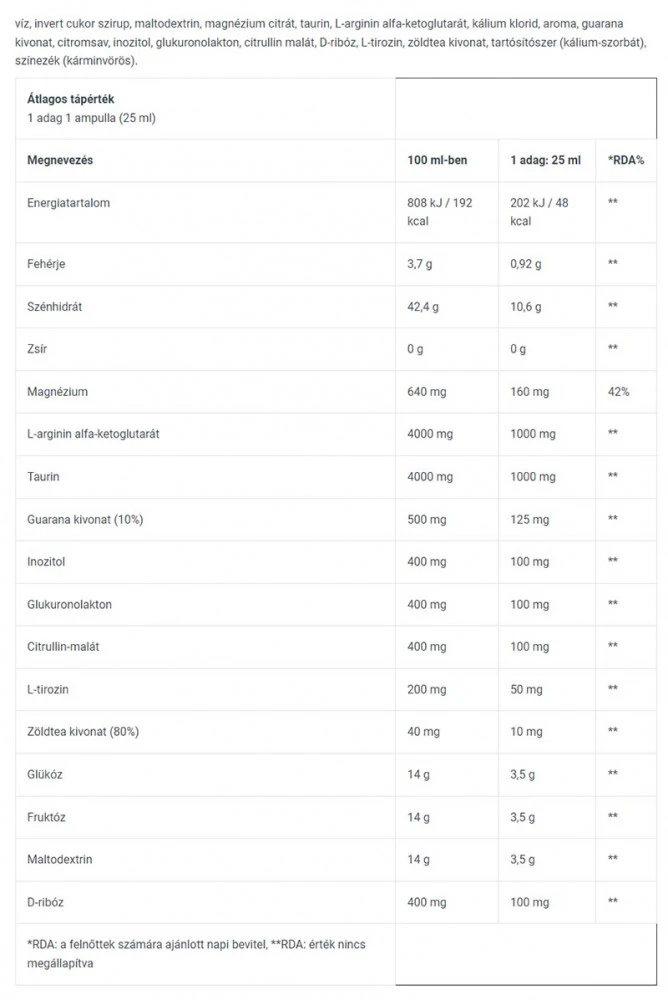 Koostisosad: vesi, invertsuhkrusiirup 28%, maltodekstriin 14%, tauriin 4%, magneesiumtsitraat, L-arginiin alfa-ketoglutaraat, tsitrulliinmalaat, glükuronolaktoon, kaaliumkloriid, lõhna- ja maitseained, guaraana ekstrakt (Paullinia cupana) 0.5%, hape (sidrunhape), inositool, D-riboos, L-türosiin (L-tyrosine), rohelise tee ekstrakt (Camellia sinensis), säilitusaine (kaaliumsorbaat).