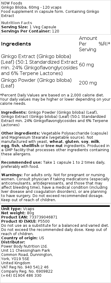 Avasta NOW Foods Ginkgo Biloba, looduslik toidulisand, mis on mõeldud igapäevaseks kasutamiseks. Iga kapsel sisaldab 60 mg ginkgo biloba ekstrakti, pakendatud mugavasse taimsesse kapslisse.