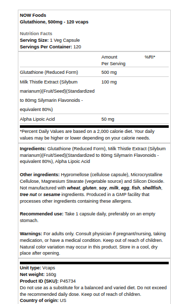 Avasta NOW Foods Glutathione, praktiline toidulisand igapäevaseks kasutamiseks. Iga pakend sisaldab 120 taimset kapslit, millest igaüks annab 500 mg glutatiooni.