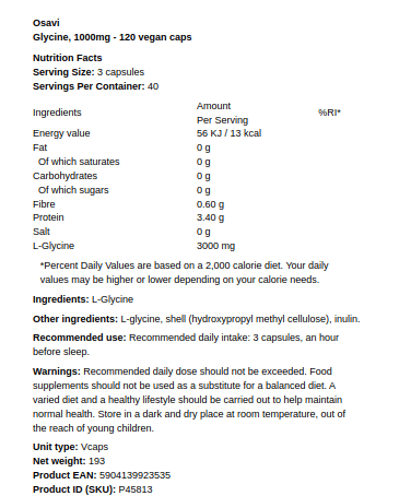 Tutvustame Osavi Glycine toidulisandit, mis on suurepärane täiendus teie igapäevasele rutiinile. Iga kapsel sisaldab 1000 mg glütsiini, valmistatud kõrgeima kvaliteedi ja puhtuse standardeid järgides. See toode sobib ideaalselt veganitele ja on valmistatud Poolas.