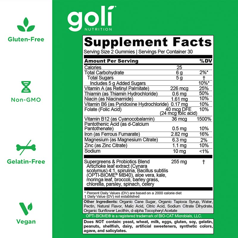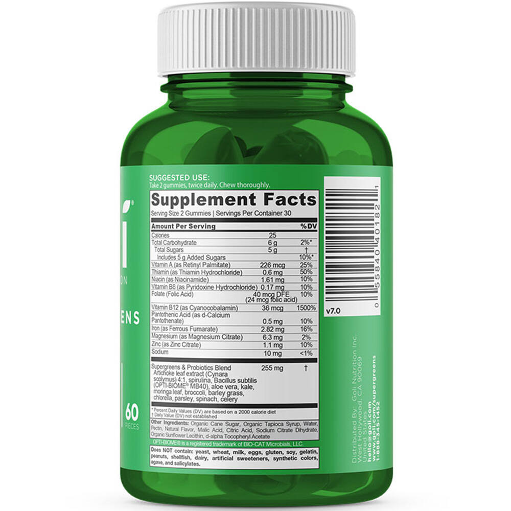 Goli Nutrition SuperGreens 60 Gummies on maitsvad kummikommi kujulised toidulisandid, mis sisaldavad erinevaid vitamiine, mineraale ning rohelistest taimedest ja probiootikumidest koosnevat segu. Pakendis on 60 kummikommi.