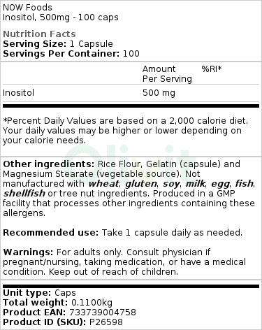 Inositool on looduslikult esinev ühend, mida leidub nii taimedes kui ka loomades. NOW Foods pakub seda puhtal kujul, et tagada toote kõrge kvaliteet. Toodetud rangelt kontrollitud tingimustes ilma tarbetute lisanditeta garanteerib see maksimaalse puhtuse ja efektiivsuse.