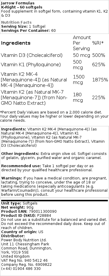 Jarrow Formulas’i K-Right toidulisandid on valmistatud USA-s, rõhutades kvaliteeti ja looduslike koostisosade kasutamist. Need pehmekapslid on lihtsalt neelatavad ning sobivad suurepäraselt kaasavõtmiseks igapäevaselt. Toidulisand sobib suurepäraselt neile, kes soovivad oma päeva jooksul mugavalt ja efektiivselt täiendada oma toitainete tarbimist.
