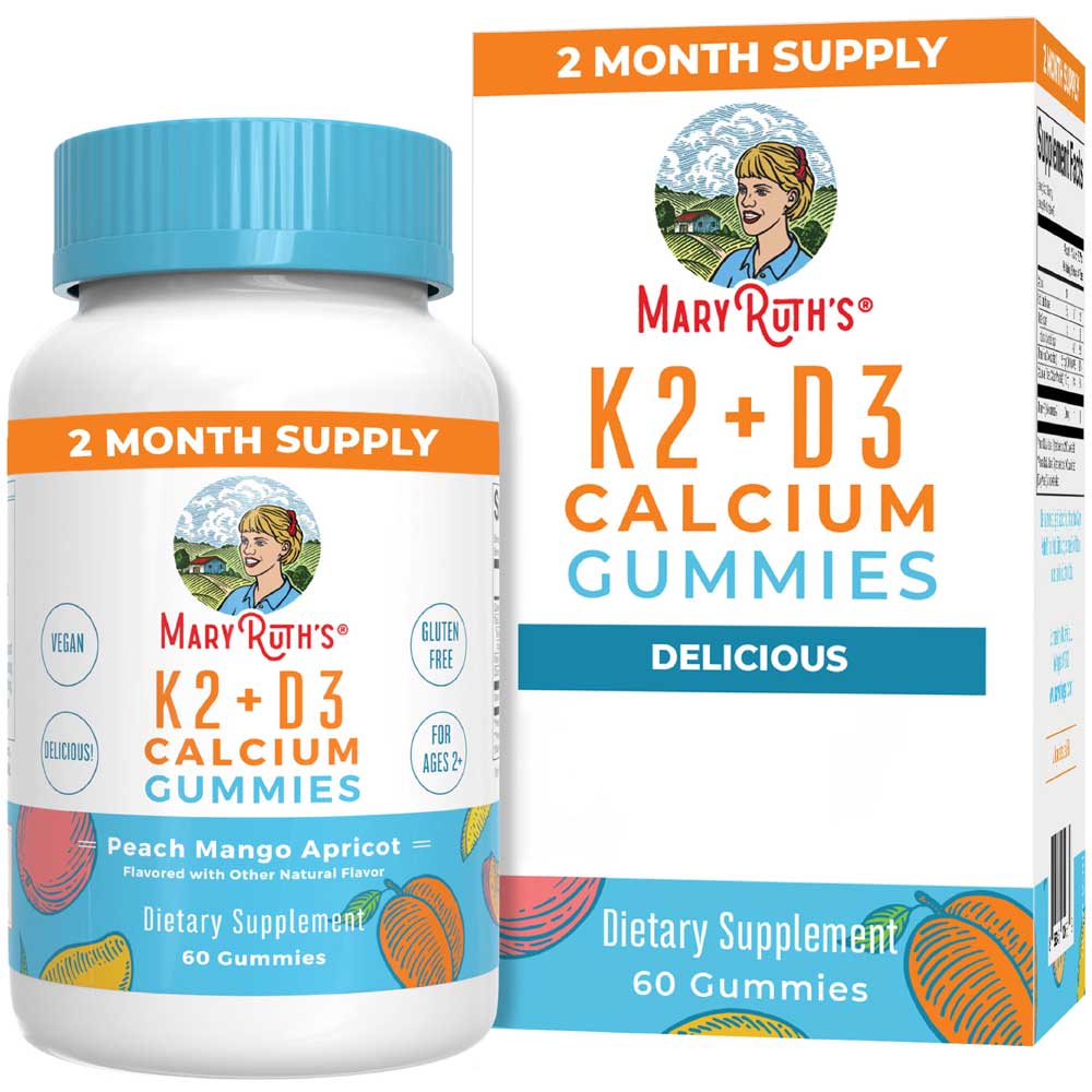 MaryRuth’s K2 + D3 Kaltsiumi Kummikommid pakuvad maitsvat virsiku, mango ja aprikoosi elamust. pakendis on 60 kummikommi, mis sisaldavad taimset päritolu D3-vitamiini (samblikust), K2-vitamiini (natost) ning kaltsiumi.