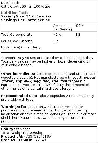 Jeg kan godt lide flaskerne på 250 enheder af Now-mærket Cat’s Claw – det holder godt, og jeg skal tage det dagligt for at lindre hævelsen og smerten i Hebedens knuder (gigthævelse i fingerleddene). Hvis jeg glemmer at tage dem, vender mine ømme fingerled tilbage inden for 24 timer, så jeg sætter pris på den forbedring, som dette tilskud gør, og jeg stoler på Now-tilskud for renhed, kvalitet og korrekte doseringsråd.