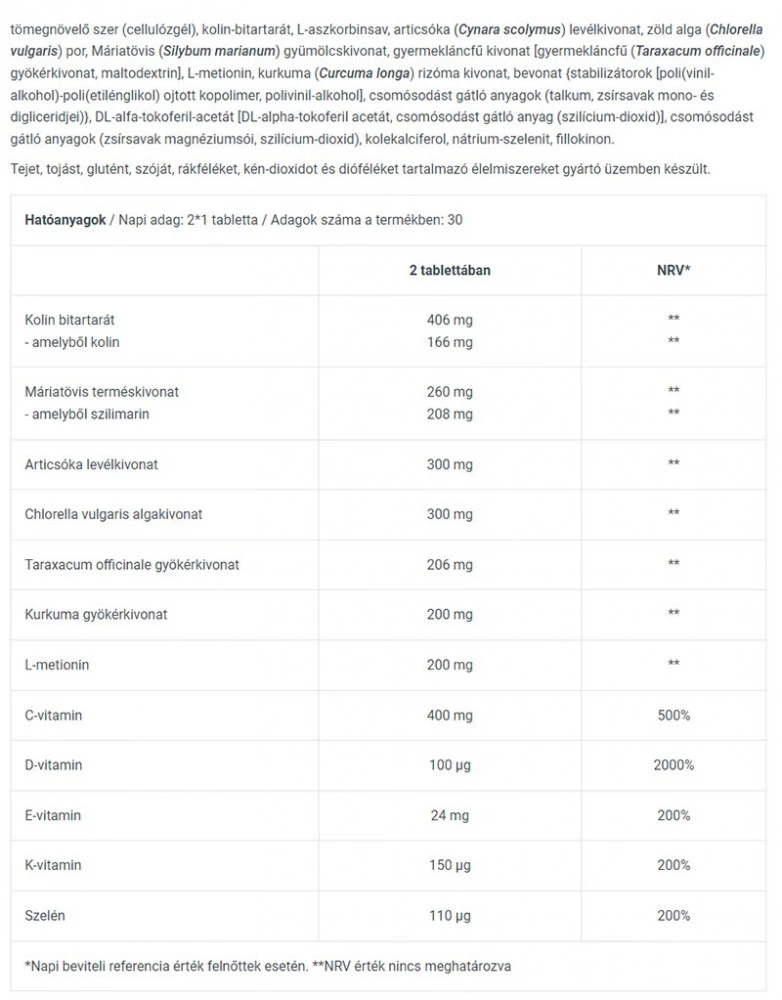 Koostisosad: koliinbitartraat (millest koliin), artišoki (Cynara scolymus) lehe ekstrakt, klorella (Chlorella vulgaris) pulber, maarjaohaka (Silybum marianum) viljaekstrakt (millest silümariin), võilille [võilille (Taraxacum officinale) juure ekstrakt, maltodekstriin] ekstrakt, L-metioniin, kurkumi (Curcuma longa) risoomiekstrakt; paakumisvastased ained: magneesiumisoolad rasvhapetest ja ränidioksiid; täiteaine: tselluloosgeel; DL-alfa-tokoferüülatsetaat [DL-alfa-tokoferüülatsetaat koos paakumisvastase ainega ränidioksiid], kateaine [stabilisaatorid: polüvinüülalkohol-polüetüleenglükool-graft-kopolümeer ja polüvinüülalkohol; paakumisvastased ained: talk ja mono- ning diglütseriidid rasvhapetest]; kolekaltsiferool; naatriumseleniit; füllokinoon.