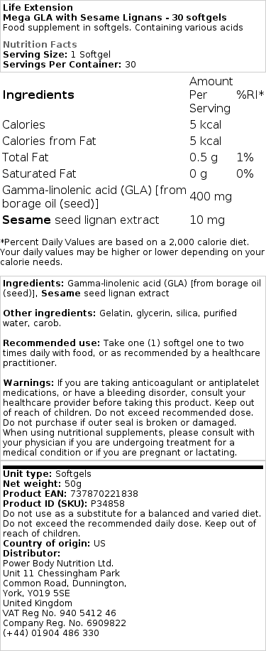 Dette er endnu en lille triumf for livsforlængelse og derfor for os! GLA med sesamlignaner. Sesamlignaner hjælper os til hurtigt at absorbere den godhed, som GLA giver os. Dette hjælper os med at tabe det uønskede fedt og hjælpe med at få vores kroppe til at blive slankere. Fedtholdige olier er gode for vores kroppe, og især vores hjerter. Dette er et fantastisk lille supplement til vores helbred og ikke til en dyr pris!