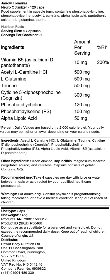 Avasta Jarrow Formulas – Neuro Optimizer, mis on praktiline täiendus Sinu igapäevasele rutiinile. See toode on valmistatud USA-s ja pakendatud 120 kapsli suuruses, et tagada mugav kasutamine.