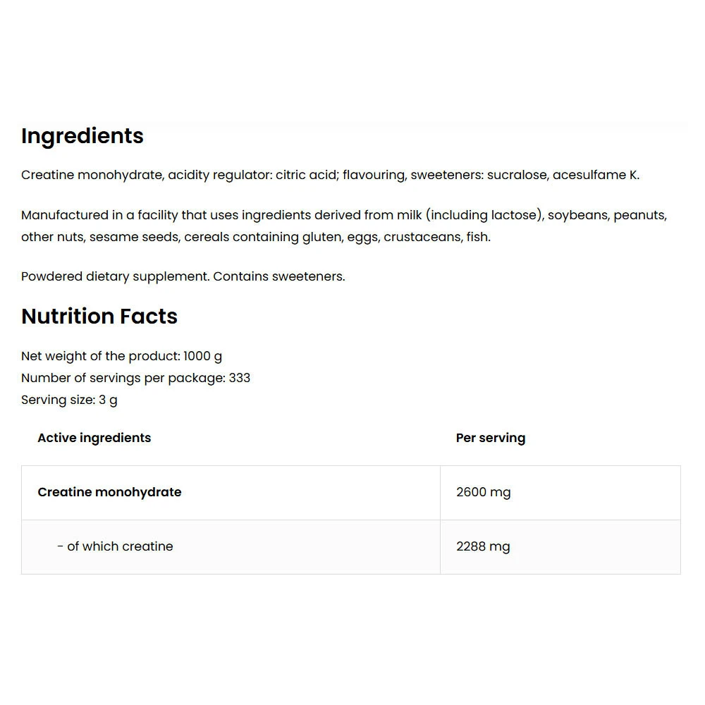 Koostisosad: kreatiinmonohüdraat (millest kreatiin), happesuse regulaator – sidrunhape, lõhna- ja maitseaine, magusained: sukraloos, atsesulfaam K.