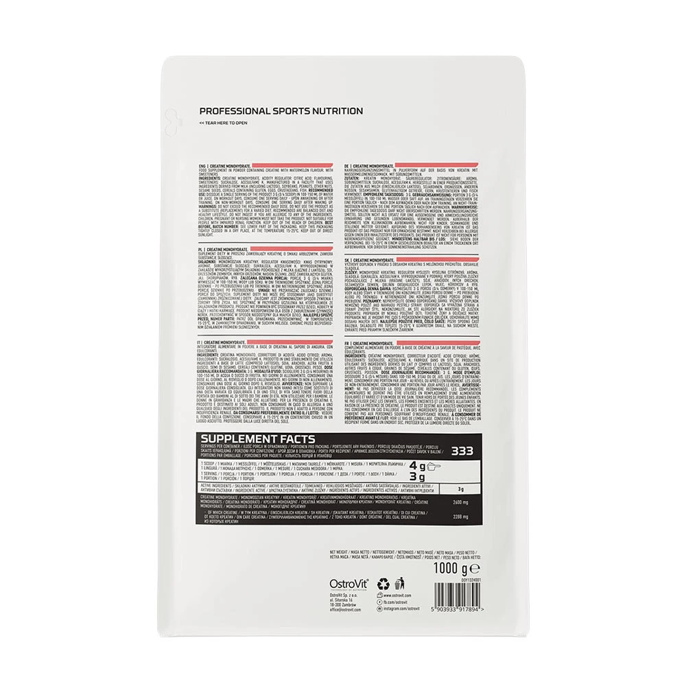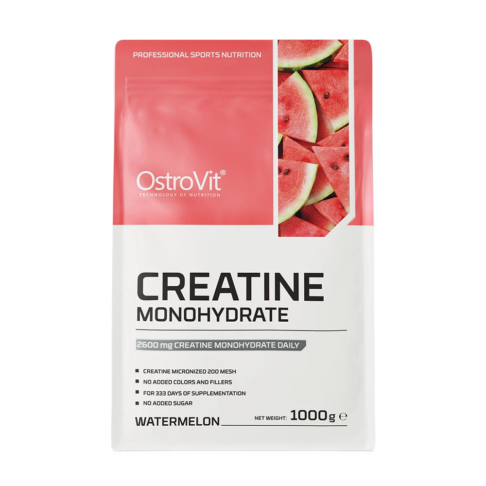 OstroVit – Kreatinmonohydrat Vandmelon 1000g on pulbriline toidulisand, mis sisaldab kreatiinmonohüdraati. Toode on maitsestatud arbuusi maitsega ning pakendatud 1000 g suurusesse purki.