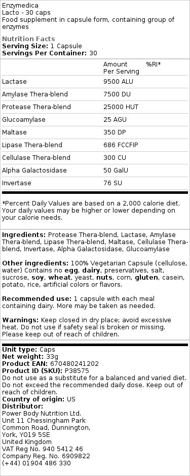 Looduslike ensüümide sisaldusega Lacto aitab kaasa normaalsele seedimisele ning on traditsiooniliselt kasutatud seedeensüümide allikana. Kapslid on lihtsalt neelatavad ja sobivad igapäevaseks tarbimiseks osana tasakaalustatud toitumisest.