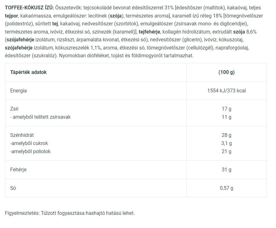 Koostisosad: piimašokolaadikate magusainega 31% [magusaine (maltitoolid), kakaovõi, täispiimapulber, kakaomass, emulgaator: letsitiinid (soja), looduslik maitseaine], karamellimaitseline kiht magusainega 18% [magusaine (maltitoolid), kondenspiim, kakaovõi, niiskusesäilitaja (sorbitool), emulgaator (rasvhapete mono- ja diglütseriidid), maitseaine, sool, värvaine (tavaline karamell)], piimavalk, kollageenihüdrolüsaat, ekstrudeeritud soja kakao lisandiga 8.6% (sojavalgu isolaat, tapiokitärklis, kakaopulber), niiskusesäilitaja (glütserool), vesi, sojavalgu isolaat, kookosõli, vähendatud rasvasisaldusega kakaopulber, maitseaine ja looduslik maitseaine.