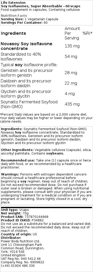 Sojaisoflavonerne har nogle fantastiske fordele for sundheden og har været hemmeligheden bag levetiden, som mange asiatiske befolkninger viser, da de indtager en høj mængde soja end vores vestlige kost. Jeg drikker sojamælk af og til, men bortset fra det er sojaindholdet i min kost næsten ikke-eksisterende, så for mig er disse tabletter den nemmeste måde at få fordelene på uden at ændre min kost for drastisk. Forbløffende til cellulær reparation og forbedring, disse løfter det generelle helbred på samme måde som antioxidanter 🙂