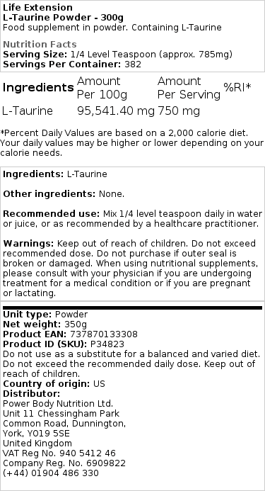Dette er pulver i stor størrelse med Taurin som ingrediens, høj kvalitet, let at tage, uden nogen smag. Det var et supplement til min kost.