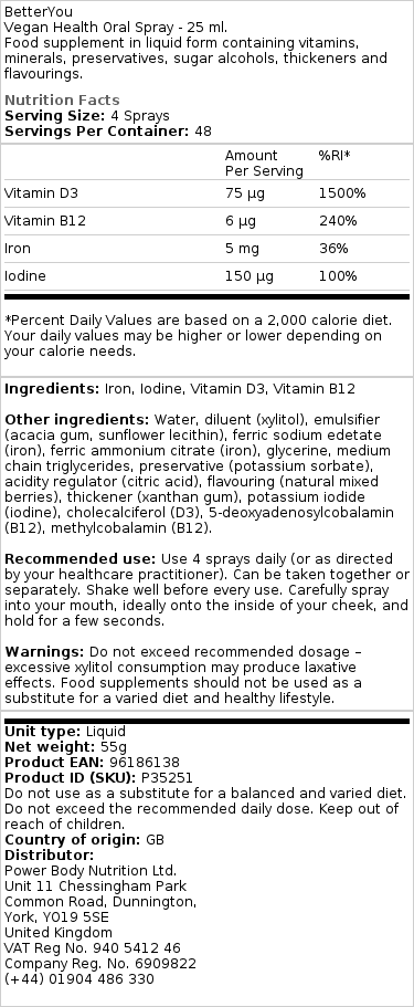 BetterYou Vegan Health Oral Spray on hoolikalt välja töötatud, et toetada tasakaalustatud ja tervislikku eluviisi. toodet iseloomustavad selle looduslik päritolu koostisosad ning see on valmistatud Suurbritannias, järgides kõrgeid kvaliteedi- ja jätkusuutlikkuse standardeid.
