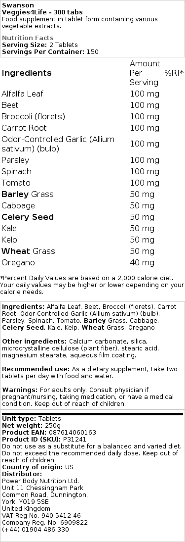 Tutvustame toidulisandit Veggies4Life, mis on loodud selleks, et toetada teie igapäevast heaolu ja aktiivset eluviisi. See kvaliteetne toode sisaldab 300 tabletti pakis ning on valmistatud Ameerika Ühendriikides, pakkudes looduslikest koostisosadest saadud eeliseid.