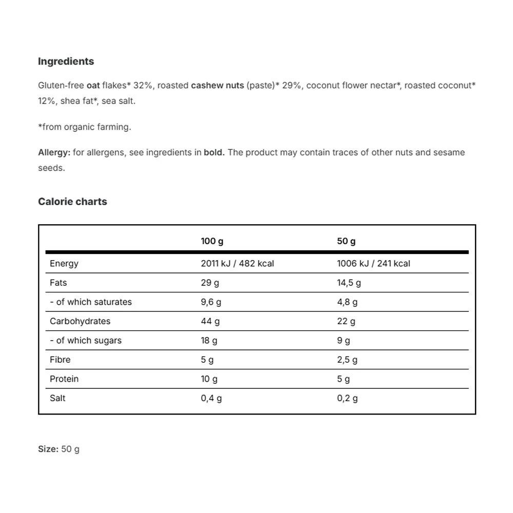 Vilgain Bio Oat Bar Coconut cashew (50 g) on maitsev kaerabatoon,mille tootjaks on Vilgain. Toode sisaldab 50 grammi batooni ning selle maitses on ühendatud kookose ja india pähkli nüansid.