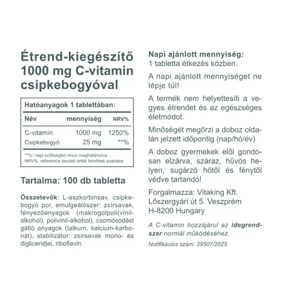 Vitaking C-1000 mg with Rosehip 25mg on Vitakingu toidulisand, mis sisaldab C-vitamiini ja kibuvitsa (Rosa canina) ekstrakti. Pakendis on 100 tabletti.