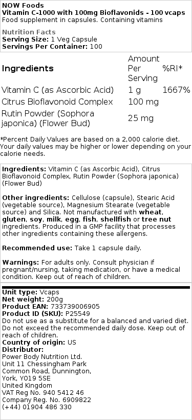 Vitamin C-1000 med 100 mg bioflavonoider virker fantastisk til at understøtte optimal generel sundhed og velvære, og et af mine vigtigste kosttilskud, som jeg tager året rundt for at understøtte en anstændig immunsystemstyrke for at forhindre, at jeg så let bliver nedslidt, vil almindelige sygdomme som forkølelse og influenza. virus, der har tendens til at gå rundt i de nuværende koldere vintermåneder her i Storbritannien, giver dette tilskud en anstændig 1000 mg C-vitamin pr. 1 kapsel, som er cellulosebaseret og ikke gelatinebaseret, hvilket gør dette til en vegansk og vegetarisk egnet form for c-vitamin . Jeg har altid en tendens til at tage minimum 1 gram om dagen for at støtte mit immunsystems styrke og føler, at det er en anstændig dosis, nogle gange er jeg gået op til 6-8 gram om dagen, hvilket er en meget høj dosis, der giver mulighed for c-vitamin at fungere som et diuretikabaseret tilskud, når det kombineres med et mælkebøtterodekstraktbaseret tilskud og høje mængder vand pr. dag f.eks. 6-8 liter. C-vitamin har en række andre sundhedsfremmende fordele såsom at hjælpe med dannelsen af kollagen for at forbedre hud-, led- og fordøjelsessundhed og øger kroppens optagelse af jern samt fremme heling af sår og beskytte mod blå mærker og blodpropper, som er blot et par andre gode grunde til at tilføje dette kosttilskud til dit ernæringsindtag for at understøtte en række vedligeholdelsesfaser, slankekurefaser og fedttab. Samlet set er dette et af de bedst veldoserede vitamin c-tilskud på markedet, der endda inkluderer en anstændig 25 mg rutinpulver pr. portion, som fungerer godt som en antioxidant, anti-inflammatorisk og en forbindelse til at forbedre blodkarstyrken og en lang levetid baseret supplement for at reducere risikoen for slagtilfælde på grund af knækkede vener eller arterier. Hvis du er ude efter et godt vitamin C-baseret tilskud, så anbefaler jeg at gå efter denne førsteklasses velskønnede version fra NOW Foods.