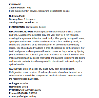 Avasta KIKI Health Zeolitpulver – looduslik toidulisand,mis on valmistatud Türgi zeoliitmineraalidest. See peeneks jahvatatud pulber on pakendatud mugavasse 60g anumasse, muutes selle igapäevaseks kasutamiseks lihtsaks.