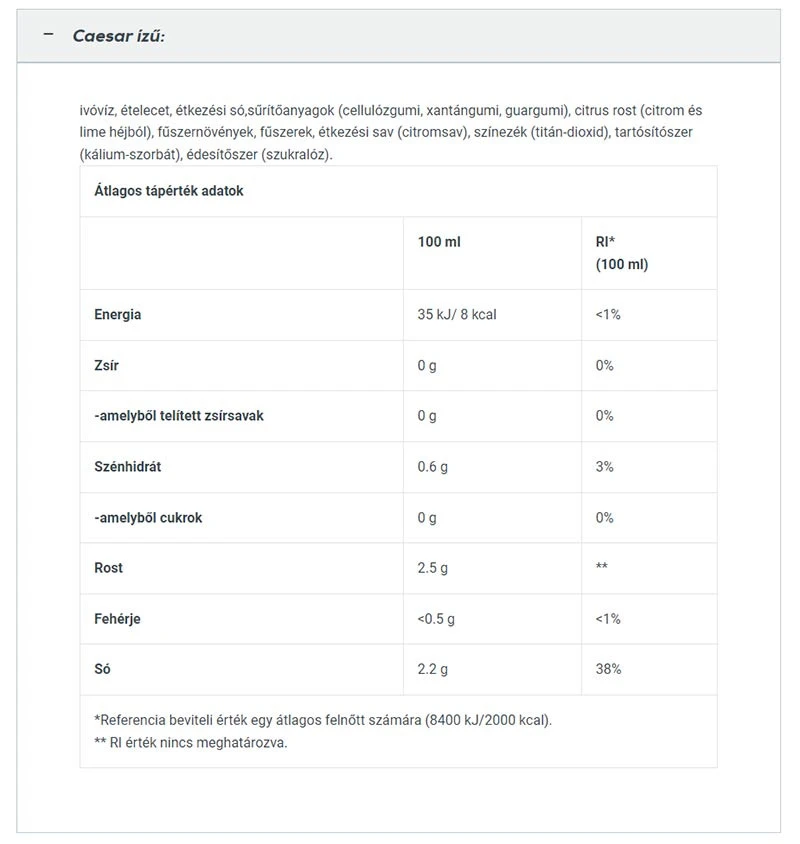 Pudel sisaldab caesarikastet, mis põhineb vees, äädikas ja tsitrusviljade kiul. Pakendist jätkub umbes 23 portsjoniks (15 ml igaüks).